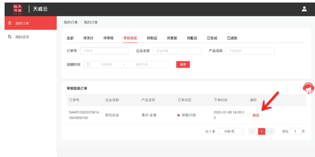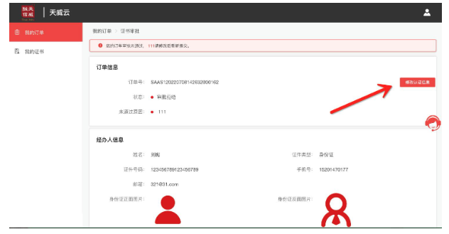 订单修改及查询网址:https://www.itruscloud.com/certsaas_cloud_console/#/login,输入经办人的手机号及验证码登录平台 (温馨提示:当时提交订单时接收短信验证码的手机号),点击上方【我的服务】——【云采盾】进入“我的订单”页面,可查看当前企业订单状态。如遇订单审核拒绝:进入订单信息后点击“立即修改”,如下图: