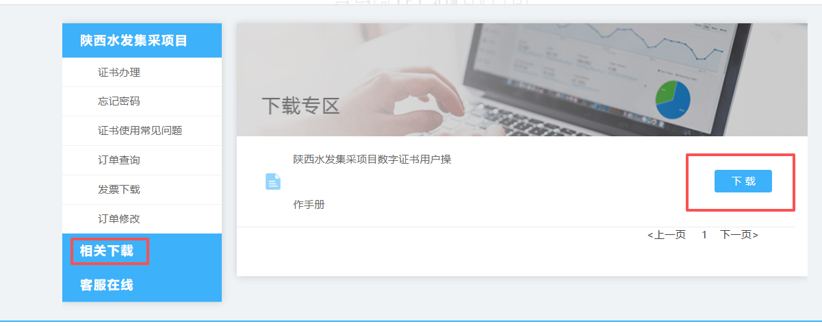 点击左侧【相关下载】-查看【陕西水发集采项目数字证书用户操作手册】-点击【下载】