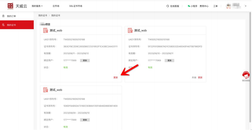 请使用购买证书的手机号码登录https://www.itruscloud.com/home/#/signMountApp/login?appCode=ycd,登录平台后点击【我的证书】,找到需要更新的证书,点【更新】提交更新的订单; 审核通过后,请在订单页面,点“更新”按钮更新下载证书即可,请您随时关注您的订单状态。