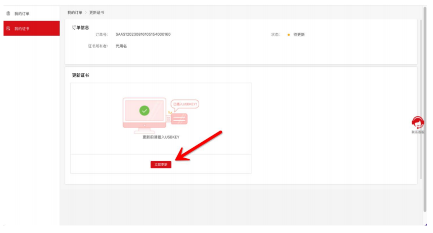 订单审核通过后,请及时下载证书,登录https://www.itruscloud.com/home/#/signMountApp/login?appCode=ycd,后点击【我的证书】,找到需要更新的证书,点【更新】按钮更新下载证书即可,请及时下载更新证书,证书过期超过90天后需要按照初始办理。