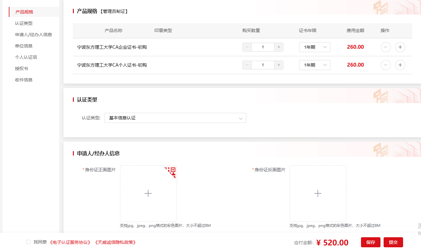 企业证书+个人证书在线办理方式:https://www.itruscloud.com/certsaas_cloud_portal/#/createOrder?productCode=CERT192627,CERT987322注:初次办理证书请办理一套(企业证书+授权人证书)