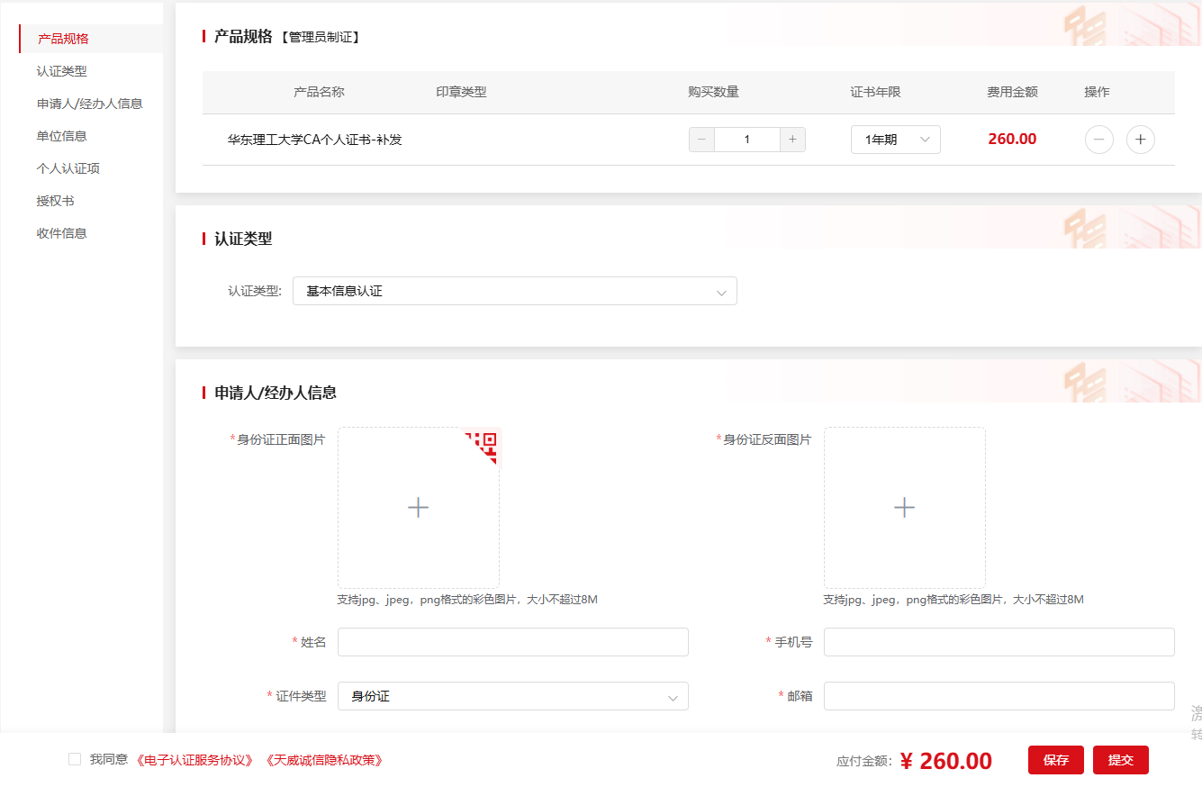 收费标准:个人证书 260元/年;