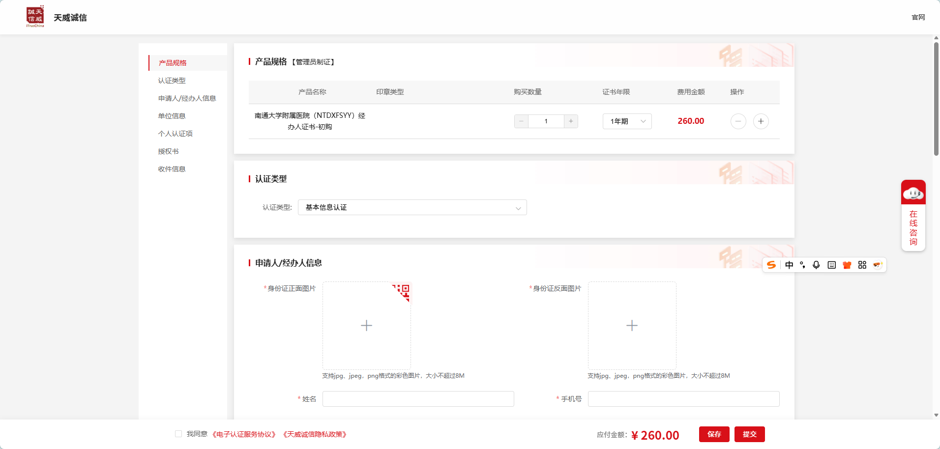 在线订单提交办理方式-数字证书购买(注:按需求办理,没有强制要求)